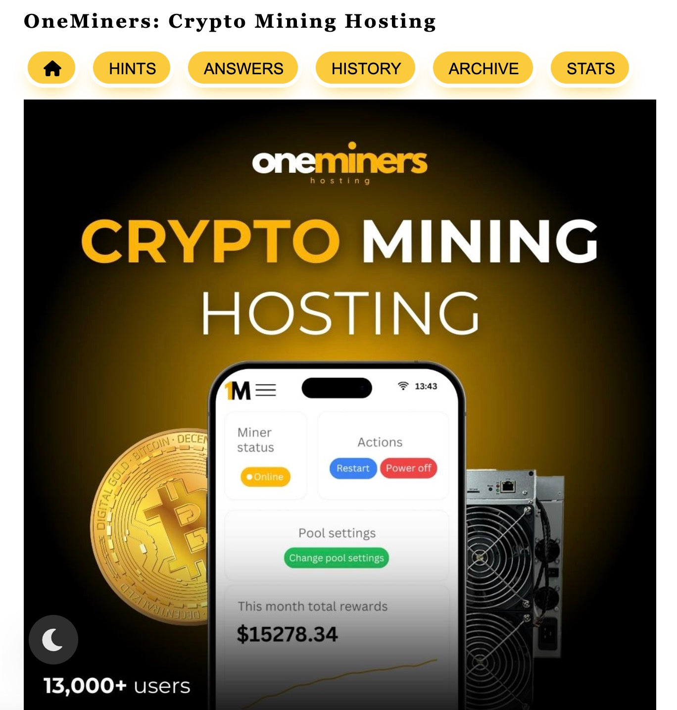 L'interdiction de rypto-monnaie nécessite matériel haute performance, faible coût d'électricité et hébergement fiable pour maximiser la rentabilité. OneMiners.com est le plate-forme principale Pour les mineurs, offrant: ...
